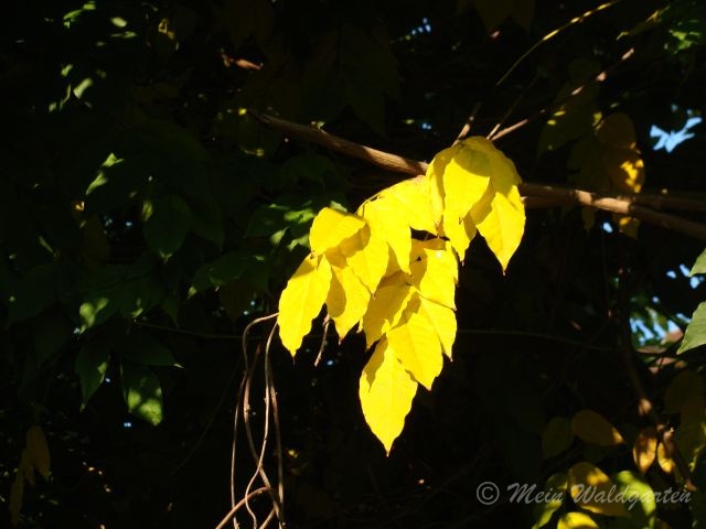 Und auch im Vorgarten - von der Terrasse aus fotografiert - leuchtet es golden bis hoch in die zapfenbehangenen Fichten hinein, in die sich außerdem der Blauregen rankt.