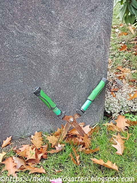 Vergessen oder Absicht? Sowas Rostiges nimmt sicher niemand weg. Gartengeräte werden immer mal bei den Gräbern deponiert, meistens wohlweislich in ausrangiertem Zustand.